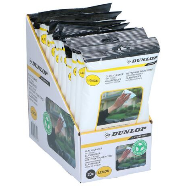 Dunlop kosteuspyyhkeet sisäpintojen puhdistukseen. Suljettavassa pakkauksessa 20 kpl pyyhkeitä. Pakkauksen koko 24 x 11 cm.100 % biohajoavaa viskoosiaMiellyttävä vaniljan tuoksu.