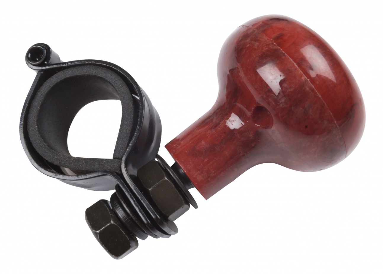 Puunvärisen nupin halkaisija n. 5 cm. Ohjauspyörän ympärille tuleva kiinnitysrengas musta,sisähalkaisija 3 cm. Renkaan sisäpinnalla irrotettava pehmuste.