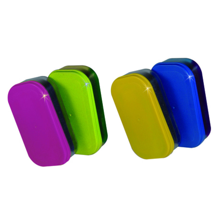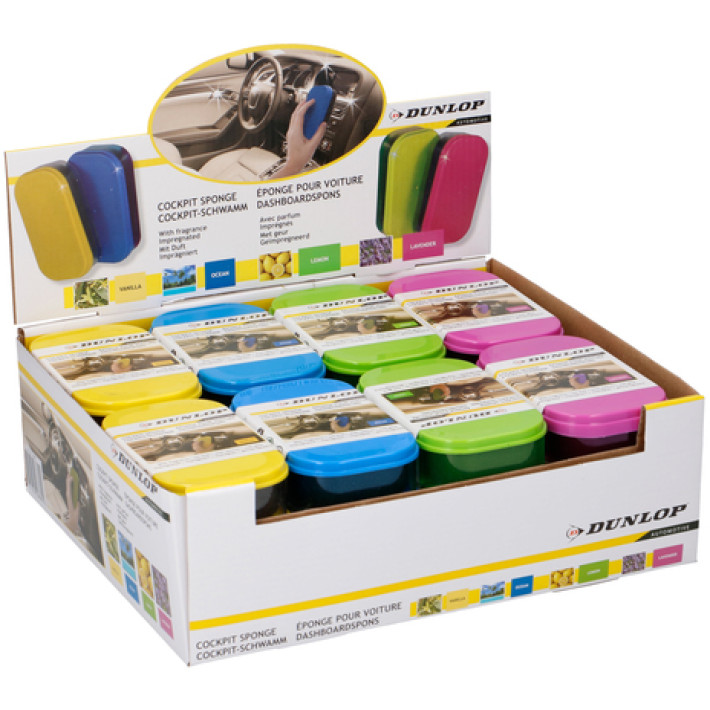 Cockpit puhdistussieni kotelossa, sienen koko 11,5 x 6 x 2,5 cm. 4 tuoksua: laventeli (lila), sitruuna (lime), vanilja (keltainen) ja ocean (turkoosi).